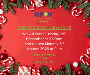 As we reach the end of another busy, brilliant year at Ripon Community House, we’d like to let you know our festive opening times.